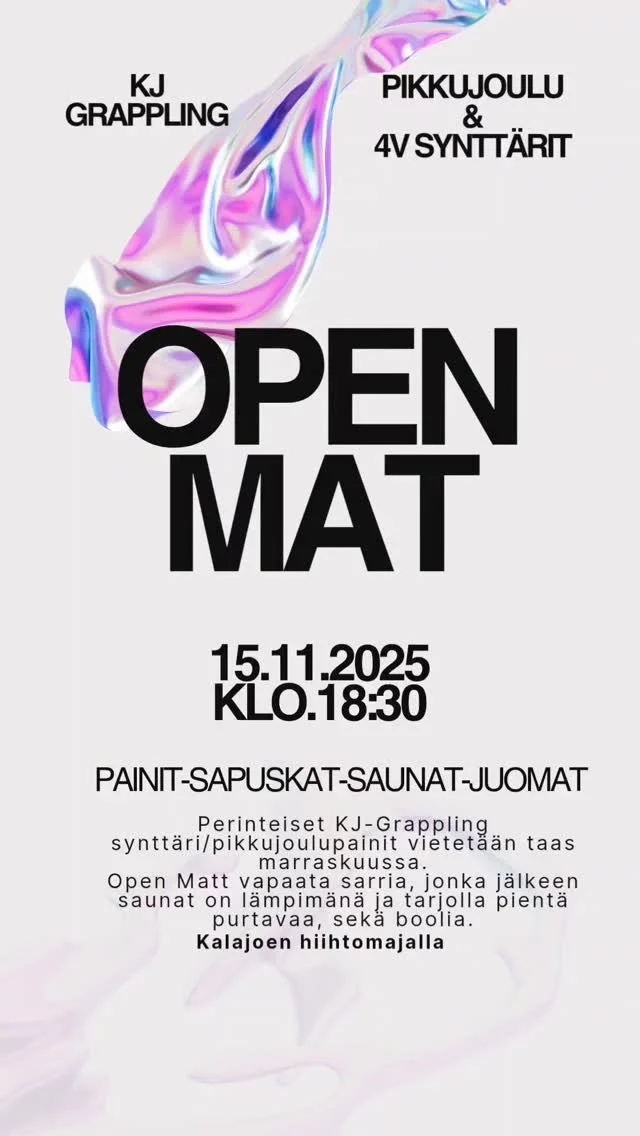 KjGrappling tarjoaa rentoa, tehokasta ja yhteisöllistä kamppailuharjoittelua kaikenikäisille ja -tasoisille harrastajille. Treenipaikkanamme toimii Kalajoen hiihtomajan yläkerta, missä hiki lentää neljä kertaa viikossa – mutta aina hyvällä fiiliksellä ja toista kunnioittaen.